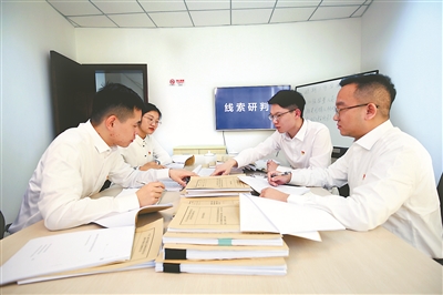 圖為近日,上海市青浦區(qū)紀(jì)委監(jiān)委工作人員針對(duì)干部檔案造假問(wèn)題進(jìn)行線索研判。 馬成思 攝