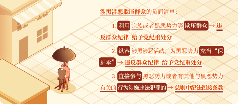 《中國共產(chǎn)黨紀(jì)律處分條例》將利用宗族或者黑惡勢力等欺壓群眾,或者縱容涉黑涉惡活動、為黑惡勢力充當(dāng)“保護(hù)傘”行為,規(guī)定為違反群眾紀(jì)律的行為,給予撤銷黨內(nèi)職務(wù)或者留黨察看處分;情節(jié)嚴(yán)重的,給予開除黨籍處分?! ?/p>