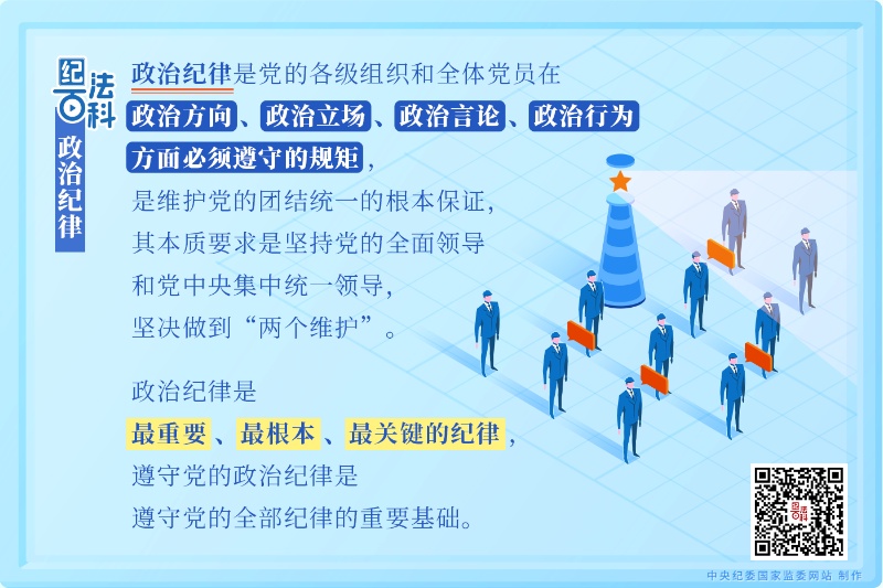 黨的紀(jì)律是多方面的,但政治紀(jì)律是最重要、最根本、最關(guān)鍵的紀(jì)律,遵守黨的政治紀(jì)律是遵守黨的全部紀(jì)律的重要基礎(chǔ)。