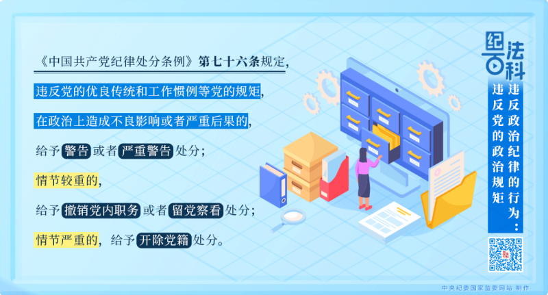 《中國共產(chǎn)黨紀律處分條例》第七十六條規(guī)定,違反黨的優(yōu)良傳統(tǒng)和工作慣例等黨的規(guī)矩,在政治上造成不良影響或者嚴重后果的,給予警告或者嚴重警告處分;情節(jié)較重的,給予撤銷黨內(nèi)職務(wù)或者留黨察看處分;情節(jié)嚴重的,給予開除黨籍處分。