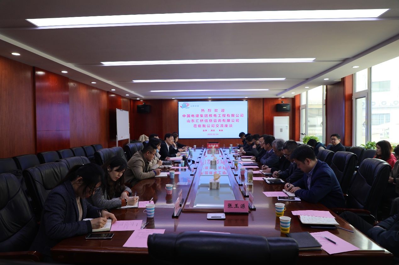 王洪濤對劉大賓與門楓葉一行的到來表示歡迎,對中國電建集團核電工程公司在高新技術(shù)企業(yè)認定、研發(fā)費用管理、績效考核等方面積累的經(jīng)驗和取得的成績,予以充分肯定;對山東匯橋信息咨詢有限公司在企業(yè)管理咨詢、財稅咨詢、科技咨詢等方面取得的成績和所具備的專業(yè)優(yōu)勢,予以充分認可。王洪濤簡要介紹了山東水設(shè)的發(fā)展近況,表示希望通過加強交流合作,增進彼此的了解,優(yōu)勢互補、互利共贏、共創(chuàng)未來。
