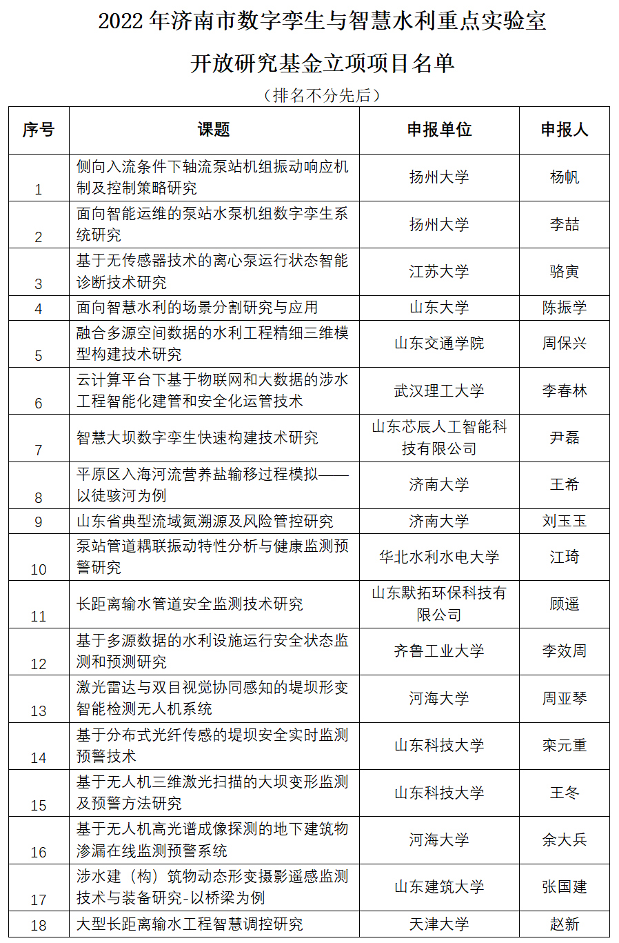 根據(jù)濟南市數(shù)字孿生與智慧水利重點實驗室開放研究基金2022年度開放研究基金申請指南的要求,經(jīng)各申請人自主申報、實驗室學術委員會專家評審,擬對按指南要求提交申報的課題中推薦18項課題予以立項公示,公示期5個工作日(12月12日至16日)。項目名單如下: