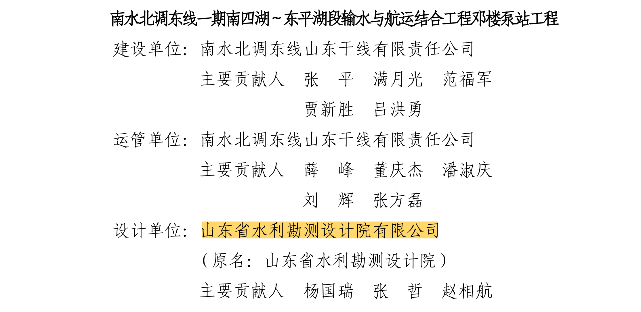 南水北調(diào)東線第一期南四湖~鄧樓泵站是南水北調(diào)東線一期工程第十二級(jí)泵站,位于山東省梁山縣境內(nèi)梁濟(jì)運(yùn)河與東平湖新湖區(qū)南大堤相交處,設(shè)計(jì)揚(yáng)程3.57米,選用液壓全調(diào)節(jié)立式軸流泵4臺(tái)套,單機(jī)設(shè)計(jì)流量33.50立方米每秒,總裝機(jī)容量8960千瓦。南水北調(diào)東線第一期工程濟(jì)南~引黃濟(jì)青段濟(jì)南市區(qū)段輸水工程是膠東輸水干線西段工程的關(guān)鍵性工程,工程設(shè)計(jì)理念先進(jìn)、成果優(yōu)秀、質(zhì)量?jī)?yōu)良,設(shè)計(jì)方案解決了復(fù)雜環(huán)境條件下輸水安全、防洪安全、城市規(guī)劃以及生態(tài)景觀多功能融合等一系列技術(shù)難題;工程建成運(yùn)行后,綜合效益顯著,在緩解區(qū)域水資源供需矛盾、優(yōu)化全省水資源配置、促進(jìn)經(jīng)濟(jì)社會(huì)高質(zhì)量發(fā)展大局中發(fā)揮了不可替代的重要作用。