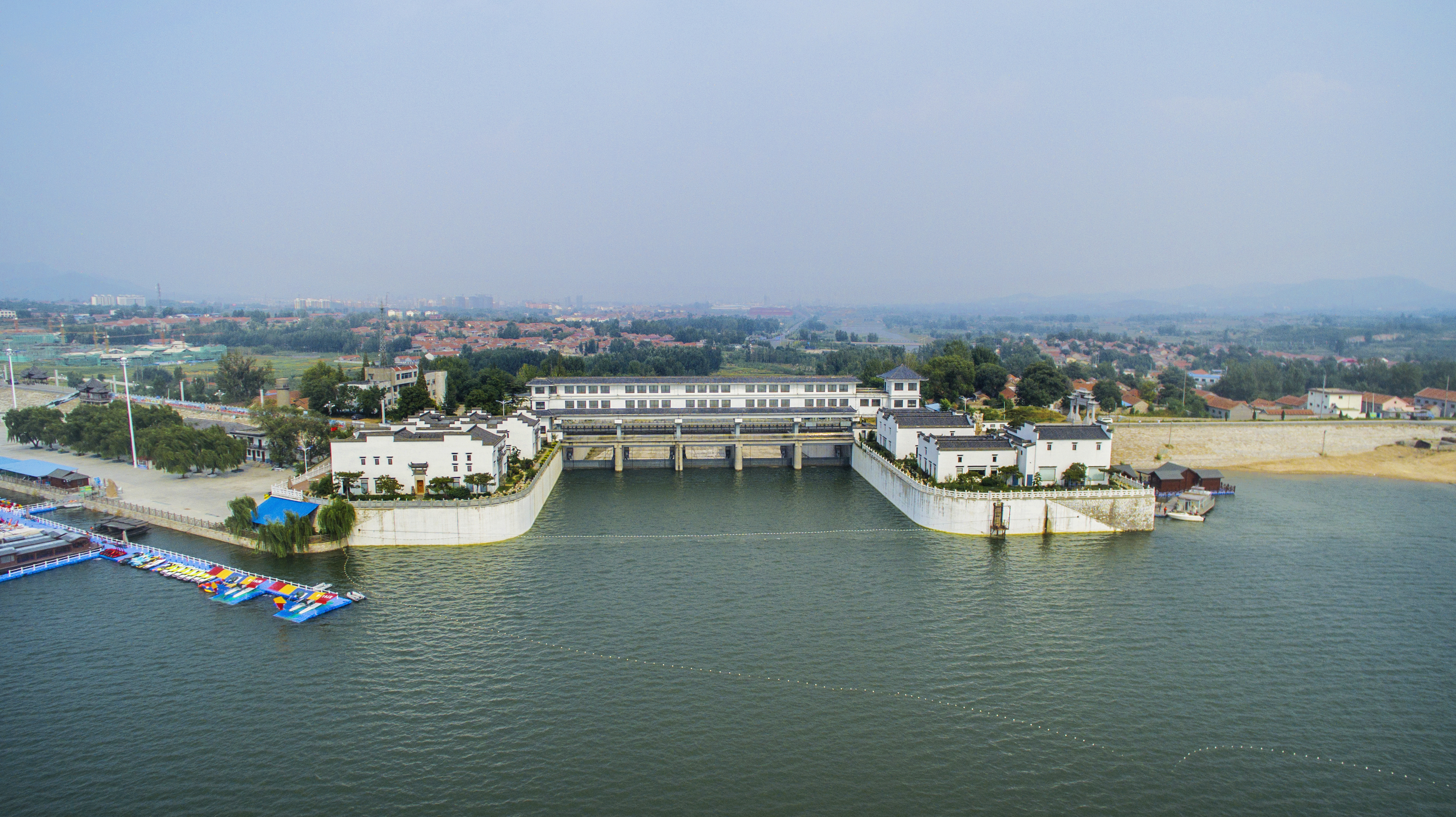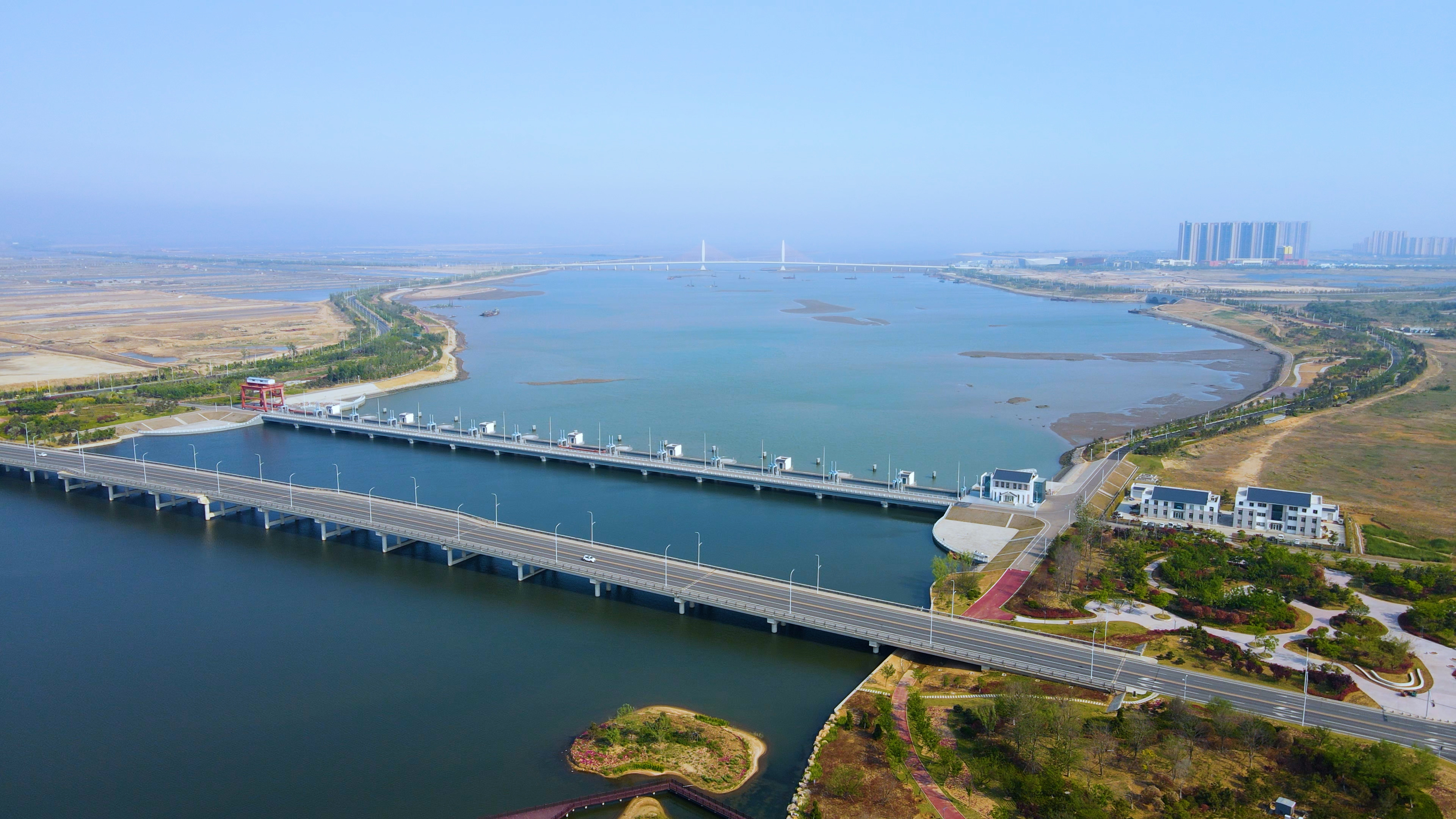 如果說南水北調(diào)山東段工程是李貴清團隊與河水的較量,香水河擋潮閘的建造則是他們與海水的博弈。香水河擋潮閘位于威海市南海新區(qū)香水河河口下游,具有擋潮、行洪、水資源開發(fā)利用、改善水環(huán)境等綜合功能。擋潮閘共14孔,每孔凈寬26米,閘室總凈寬為364米。批復(fù)概算4.0億元。針對該工程復(fù)雜的海洋運行環(huán)境和威海南海新區(qū)創(chuàng)建地標(biāo)性建筑物的要求,李貴清指導(dǎo)項目組大膽運用新技術(shù)、新材料,解決了復(fù)雜海洋環(huán)境條件下結(jié)構(gòu)的耐久性問題;通過采用大跨度閘室結(jié)構(gòu)和原創(chuàng)性新型大跨度雙拱閘門結(jié)構(gòu)(獲得國家發(fā)明專利)的應(yīng)用,結(jié)合新穎建筑構(gòu)思,工程已成為南海新區(qū)一個地標(biāo)性工程,為南海新區(qū)招商引資和文旅開發(fā)奠定了基礎(chǔ)。該項目建成后,解決了當(dāng)?shù)胤里L(fēng)暴潮問題,實現(xiàn)了水資源綜合利用,改善了區(qū)域內(nèi)生態(tài)、投資環(huán)境等,具有顯著的經(jīng)濟和社會效益。年平均擋潮效益3034萬元,年供水效益5233萬元。