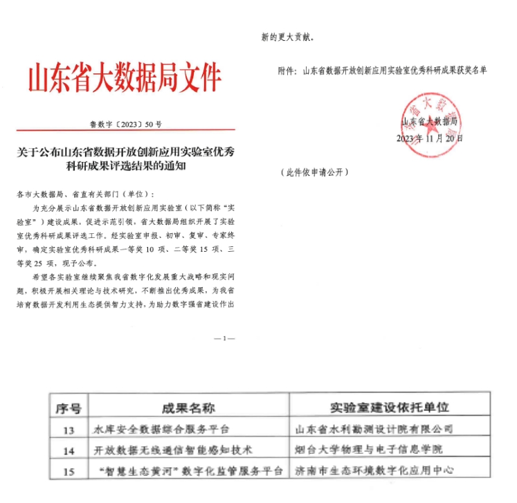 近日,山東省水利勘測(cè)設(shè)計(jì)院有限公司(以下簡(jiǎn)稱山東水設(shè))智慧水利院(技術(shù)研發(fā)中心)的水庫(kù)安全數(shù)據(jù)綜合服務(wù)平臺(tái)研發(fā)成果,獲得2023全省數(shù)據(jù)開(kāi)放創(chuàng)新應(yīng)用實(shí)驗(yàn)室優(yōu)秀科研成果二等獎(jiǎng)。