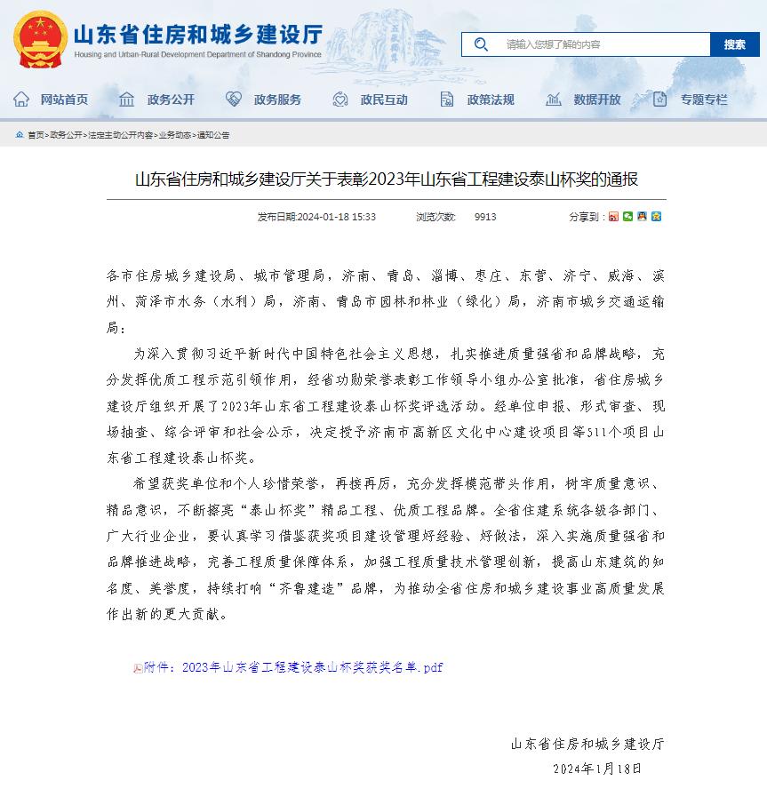 近日,山東省住房和城鄉(xiāng)建設廳印發(fā)《關于表彰2023年山東省工程建設泰山杯獎的通報》,發(fā)布了2023年泰山杯獎獲獎項目名單,山東省16項水利工程榮獲省2023年工程建設“泰山杯”獎,其中9個項目為山東省水利勘測設計院有限公司(以下簡稱公司總部)及權(quán)屬企業(yè)參建完成。